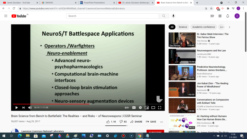 In deze video spreekt dr. Giordano, een arts die werkt voor Darpa en het Pentagon. Hij spreekt zich regelmatig uit over "bio-neurohacking" en de mogelijke toepassingen daarvan op mensen. Hier praat hij over Brain Machine Interfaces voor warfighters, soldaten dus. Het leger zegt zelf: "5G will connect our warfighters with our weapon systems".