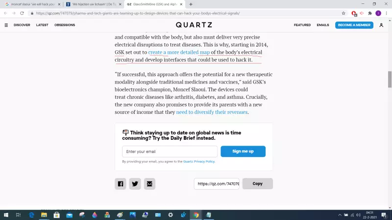 Zie wat ik onderstreept heb rechts: als je iets in je lichaam geïnjecteerd krijgt dat niet groter is dan een stofdeeltje kunnen niet alleen je lichaamsfuncties gemonitord en uitgelezen worden; je spieren en zenuwen kunnen er ook mee aangestuurd worden. Dat betekent dat je letterlijk op afstand gemarteld kunt worden, als ze er voor kiezen je zenuwen af te knellen. Dat heet "No touch torture" en ik heb het ook meegemaakt. Daarnaast kunnen zo ook je lichaamsdelen door anderen aangestuurd worden; dus zoals bij mij, dat mijn arm ineens omhoog ging zonder dat ik dat deed.